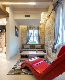 Outside, at the front of the villa, you will find a walled courtyard with outdoor furniture and a dining area as well as a glass bridge that connects you to an upper terrace with a furnished relaxation area. To the rear of the villa, you will find a terraced Mediterranean garden which features lawns, a swimming pool, a shady lounge/dining area and a herb garden, where you can pick fresh spices.