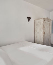 From the pretty, private courtyard, you enter the open plan living area with a sitting area (with sofa and chair), a dining area (with table seating four) and a well-equipped kitchen area. The sleeping area includes one master bedroom (with double bed) with a domed ceiling and a view of the courtyard, as well as one bathroom (with bath).