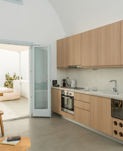 In the villa, you will find a large open plan studio room. The studio has access to a private outdoor terrace (with jacuzzi and sea views) and consists of a sitting area (with sofa/daybed), a dining area (with a table for 2) and a well-equipped kitchen area. The sleeping area consists of a king-size bed and an ensuite bathroom (with shower).