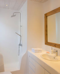 The entrance to the property is on the upper level where you will find a spacious living space with a sitting area (with comfortable seating), a dining area (with table and chairs) and a well-equipped kitchen. You will also find one double bedroom (with double bed) with en-suite bathroom (with shower), a dressing room and a private balcony with a sea view. There is also a guest bathroom (with toilet).