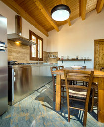 The living area comprises a natural wooden table surrounded by modern black-and-white chairs, the walls are made of exposed stone, lending a charming, rustic feel to the space and there is a spacious sofa with 3 seats. A separate well-equipped kitchen and a table with six chairs complete the ground floor. There is the only bedroom on the ground floor which contains a modern double bed and a single bed.